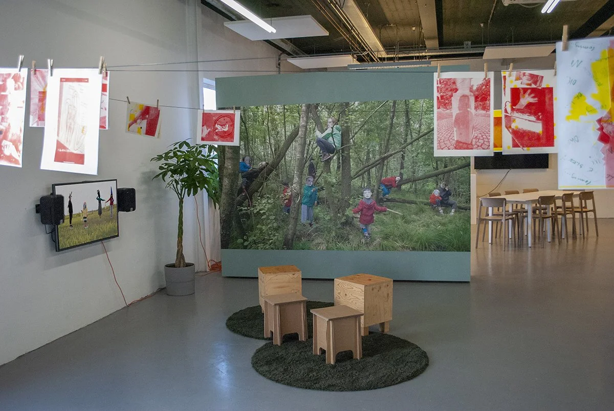 “Forest Ghosts” (2019) is mounted larger-than-life as a wallpaper in the presentation in combination with two video works by the collective. Central to the presentation are prints from the two-day Riso workshop made prior to the opening and presented with objects, tools, and materials used for reproductional labor such as (rotary) clotheslines, and wall drying racks. Through personal writing exercises, photography, and drawing inspired by the collective’s developed methods, as found in the publication, the participants have aligned themselves with ancestral figures of feminist discourses and artmaking. While taking these starting points as a common ground, their goal is to establish new vocabularies and narratives around the maternal for future generations. This collective reflection and dialogue between members of MATERNAL FANTASIES and other feminist makers, caregivers, and artist-mothers form a significant contribution and important layer to the presentation and MATERNAL FANTASIES approach to feminist practices.